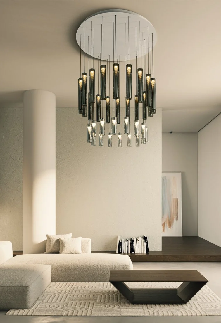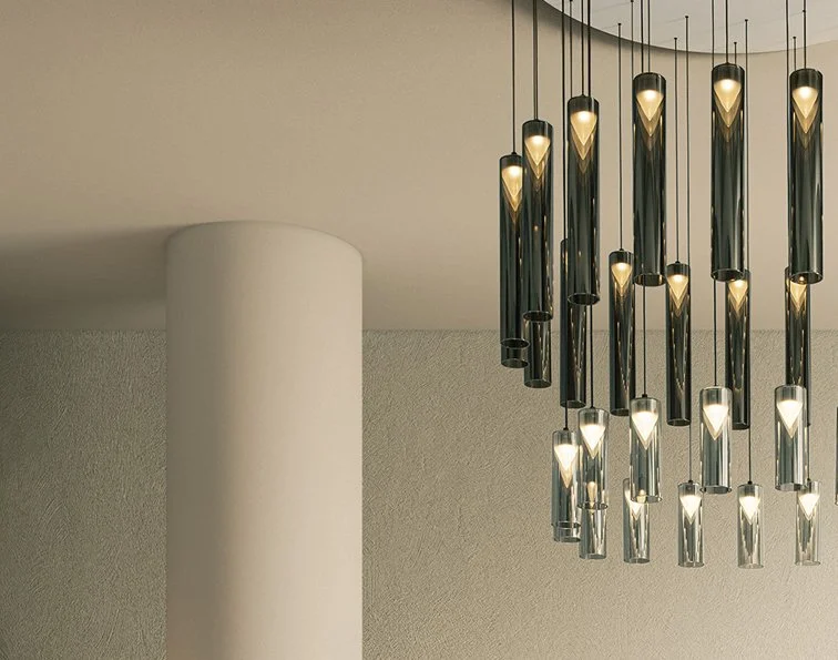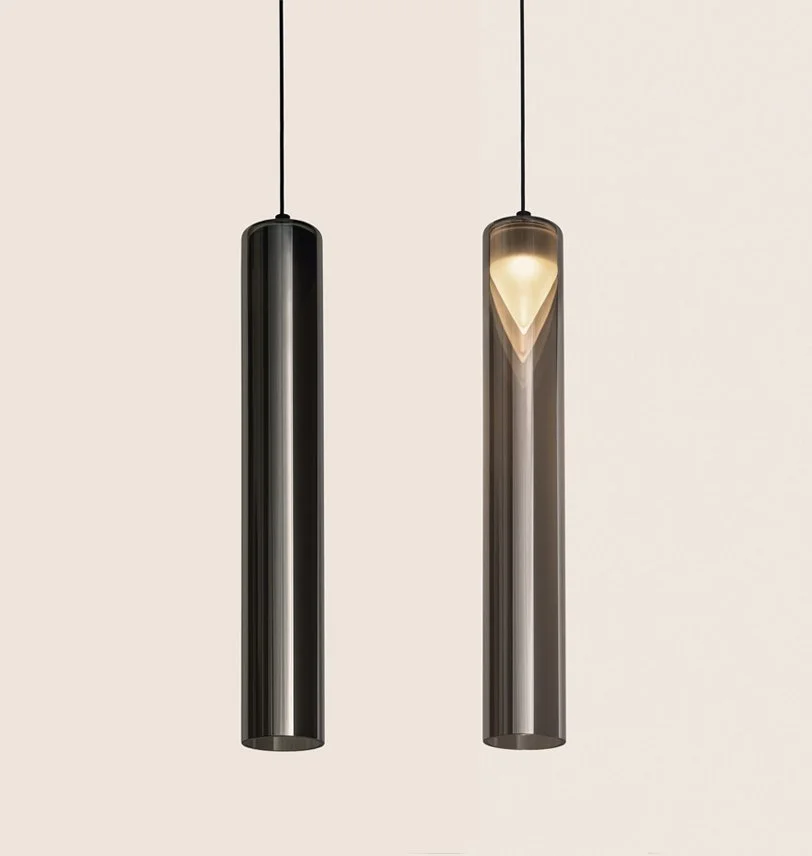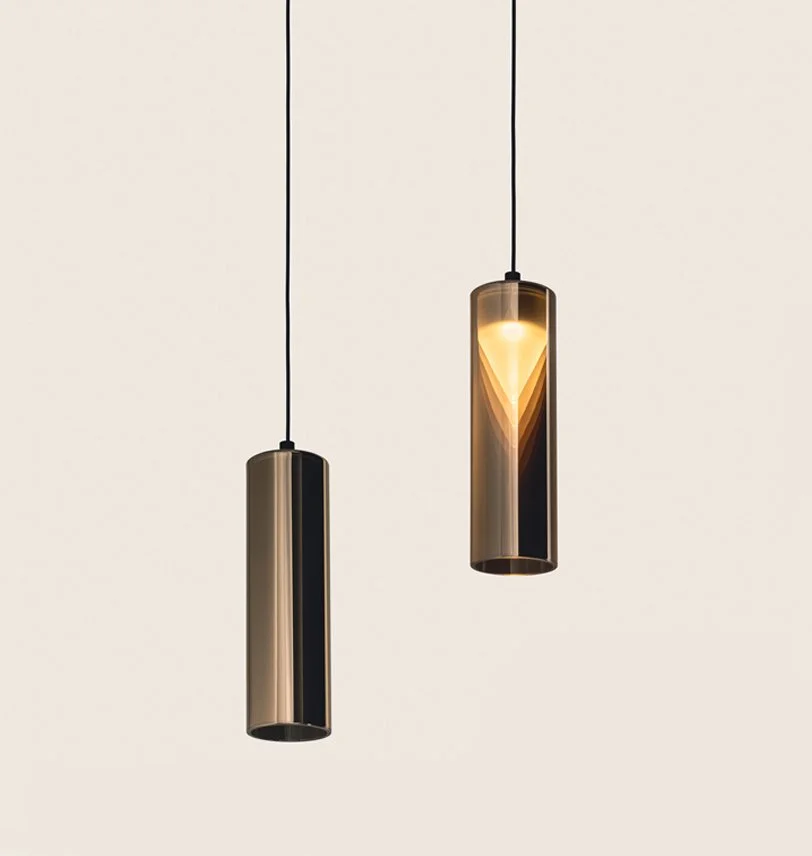 L’interazione luce-materia definisce la forma del prodotto. I raggi luminosi rendono il cilindro esterno semi-trasparente e magicamente rivelano un nuovo volume opalescente che sembra fluttuare liberamente. In questo sofisticato gioco di riflessioni si manifesta anche un’illusione ottica sorprendete: una moltiplicazione quasi infinita del volume conico, la cui percezione varia in funzione della posizione dell’osservatore. Iconica è disponibile in tre finiture (silver, rame, oro) e in due lunghezze (20cm-40cm). Ogni elemento può essere utilizzato singolarmente o concepito come un modulo da organizzare a piacere nello spazio.